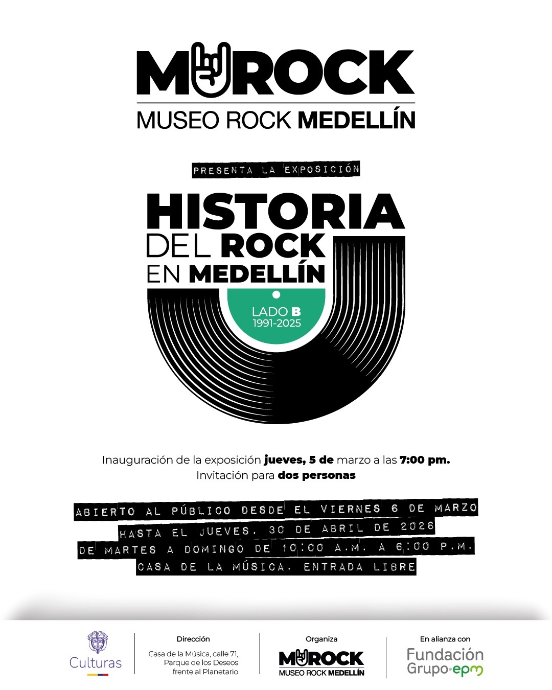 La exposición está abierta al público con entrada libre de martes a domingo, entre las 10:00 a. m. y las 6:00 p. m., en el Museo del Rock de Medellín – MUROCK, ubicado en la Carrera 45 #56-11, sector Villanueva, Medellín.